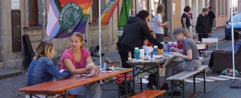 Im September folgte der Park(ing) Day – ein Event, das in der Vergangenheit von der Greenpeace Ortsgruppe organisiert wurde, nun aber nicht mehr allein gestemmt werden konnte. Gemeinsam wurde das Event ein voller Erfolg. Statt parkender Autos konnte man auf der Friedrichstraße kochen, basteln, sich einen eigenen Smoothie zu erradeln und zu Jazzmusik tanzen.