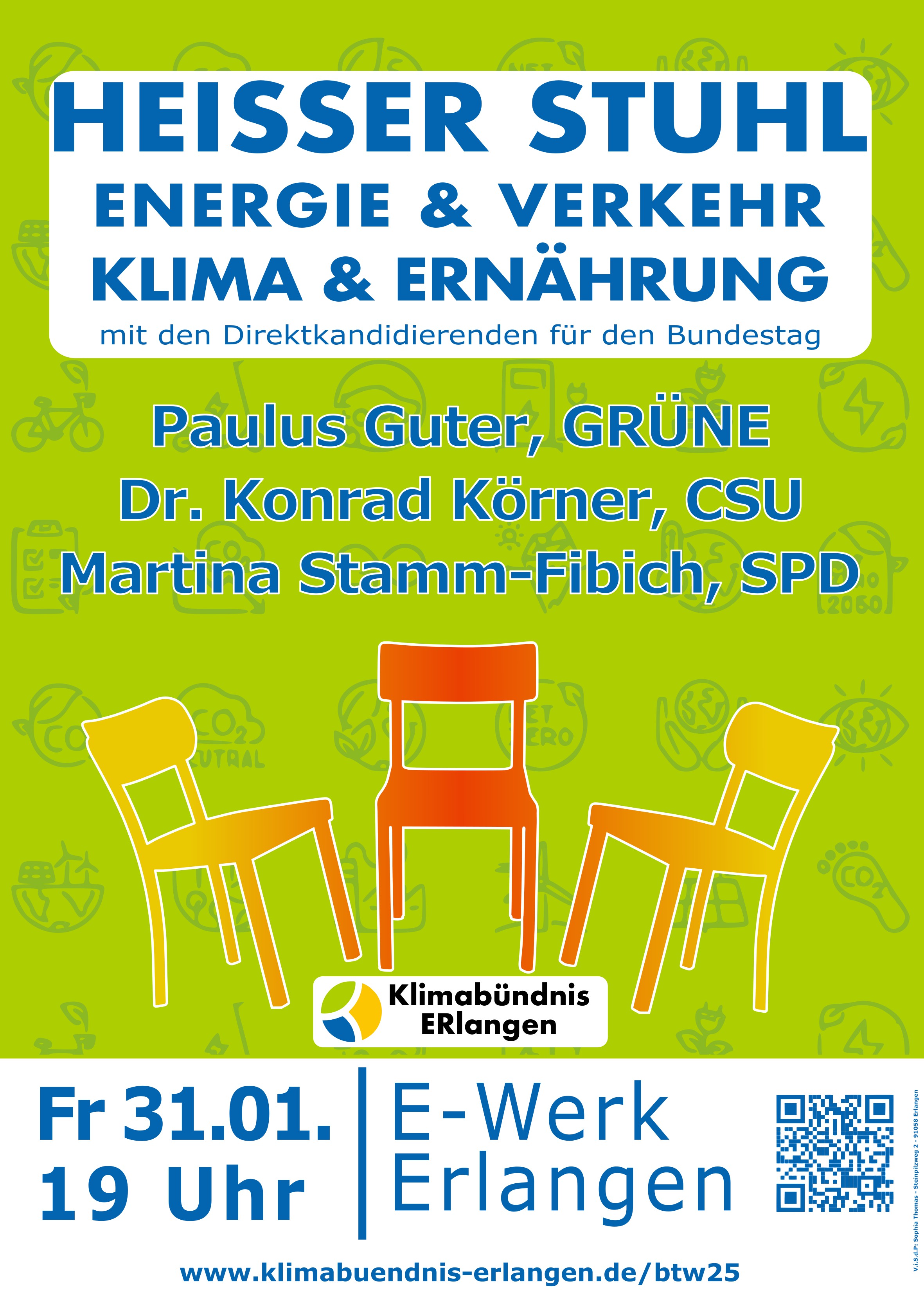 Am Freitag, den 31.01., um 19 Uhr lädt das Klimabündnis Erlangen zu einer interaktiven Podiumsdiskussion im E-Werk ein. Thema des Abends: Klimaschutz mit Blick auf die Bundestagswahl. Diskutieren werden die Direktkandidierenden des Wahlkreises Erlangen mit den besten Chancen auf das Direktmandat: Konrad Körner (CSU), Martina Stamm-Fibich (SPD) und Paulus Guter (Bündnis 90/Die Grünen).